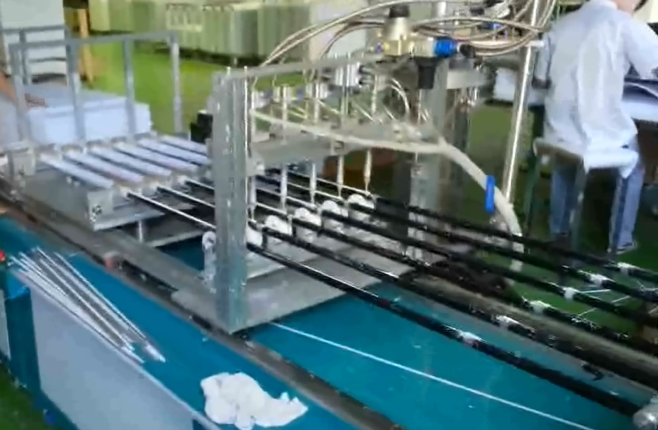 Put six PCB strips downside on the fixture sticks. Six PCB strips on the fixture sticks are being glued while being inserted to the glass tube. The tubes press down for few seconds and stick with PCBs. The whole process is finished when the sticks are pulled out and tubes are transferred to the next work station.
