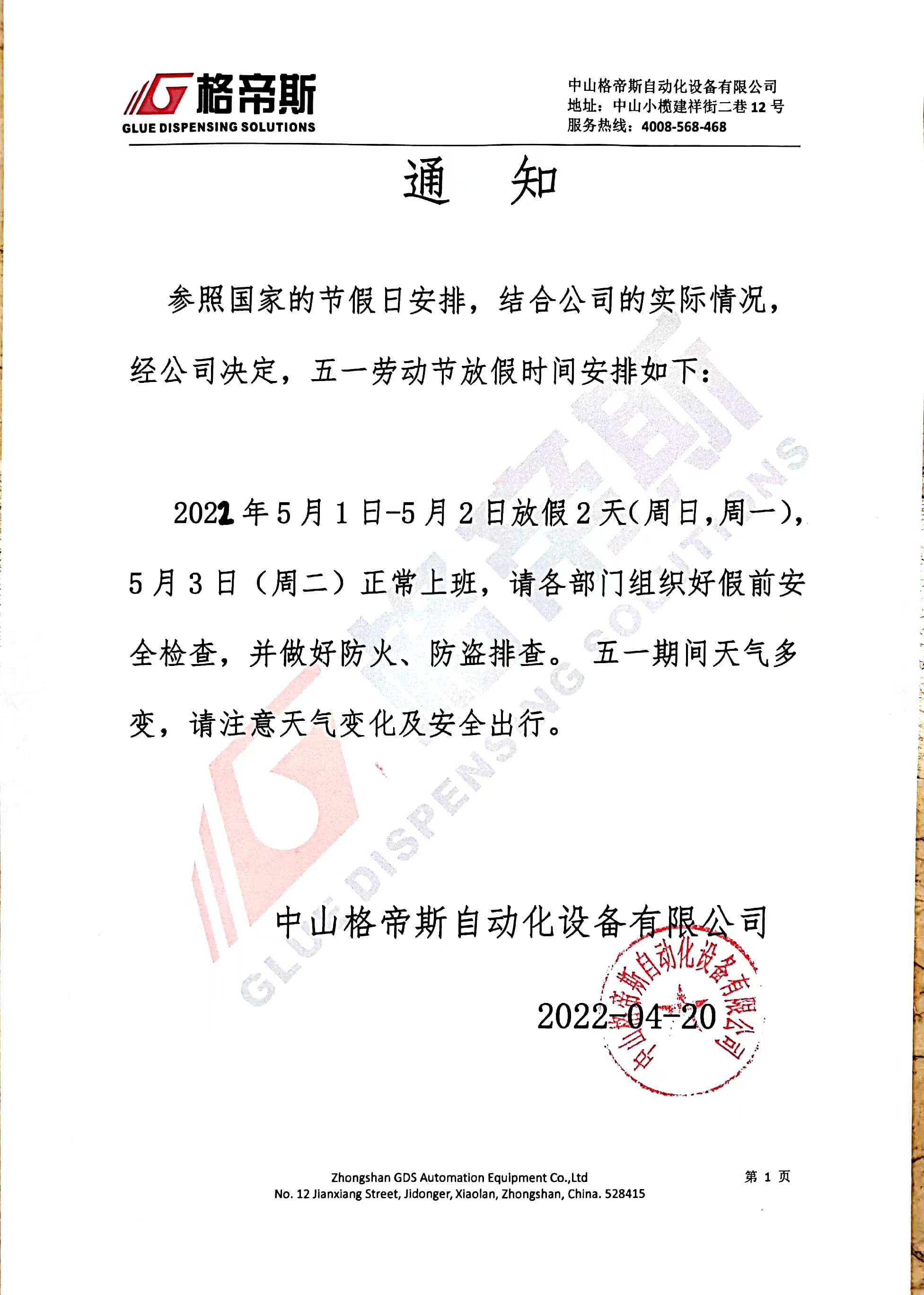 全体员工:五一国际劳动节将至,根据《国务院办公厅公布2022年放假安排》,结合公司的实际情况,现就2022年五一放假安排通知如下:5月1日至5月2日放假,5月3日正常上班,共2天。