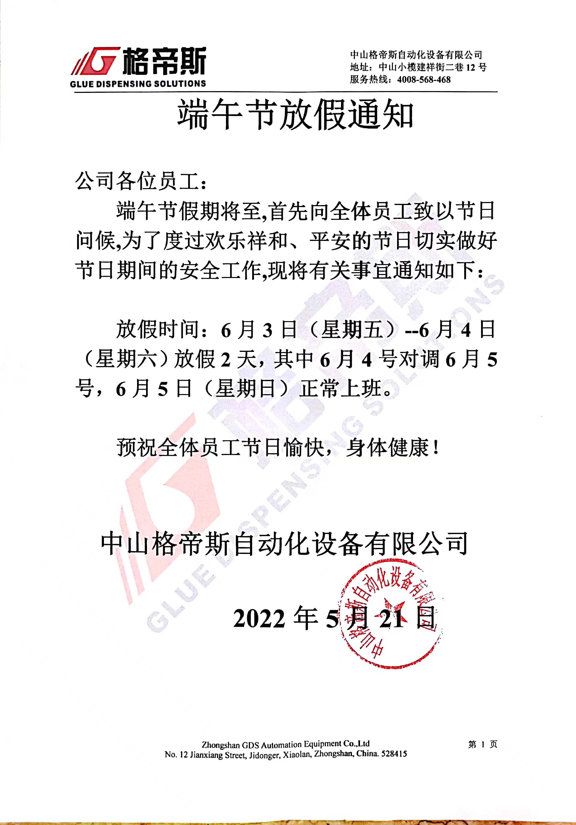 关于2022年端午节放假安排的通知